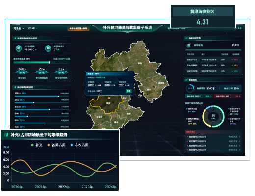 提供補充耕地和占用耕地數據的動態管理,包括指標數據統計、圖斑分布情況及耕地指標及耕地指標掛鉤分布情況